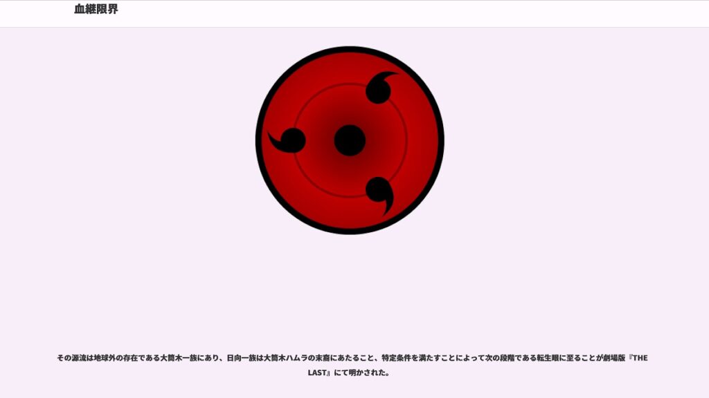 うちは一族の血継限界。開眼の条件は、うちは一族の者が「大きな愛の喪失や自分自身の失意にもがき苦しんだ時」であるとされる。その結果として脳内に特殊なチャクラが吹き出し、視神経に反応して眼に変化が現れ写輪眼になる。