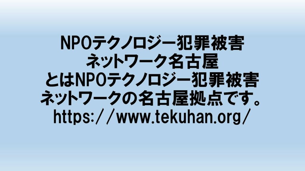 NPOテクノロジー犯罪被害ネットワーク名古屋とはNPOテクノロジー犯罪被害ネットワークの名古屋拠点です。https://www.tekuhan.org/