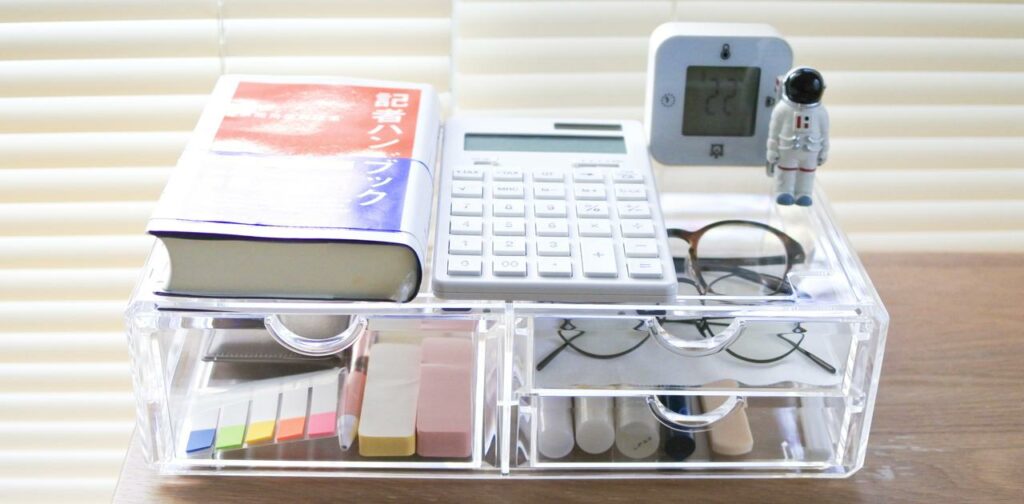 机の上の収納の正解。ポイントは透明な見た目と、引き出しの絶妙な高さ